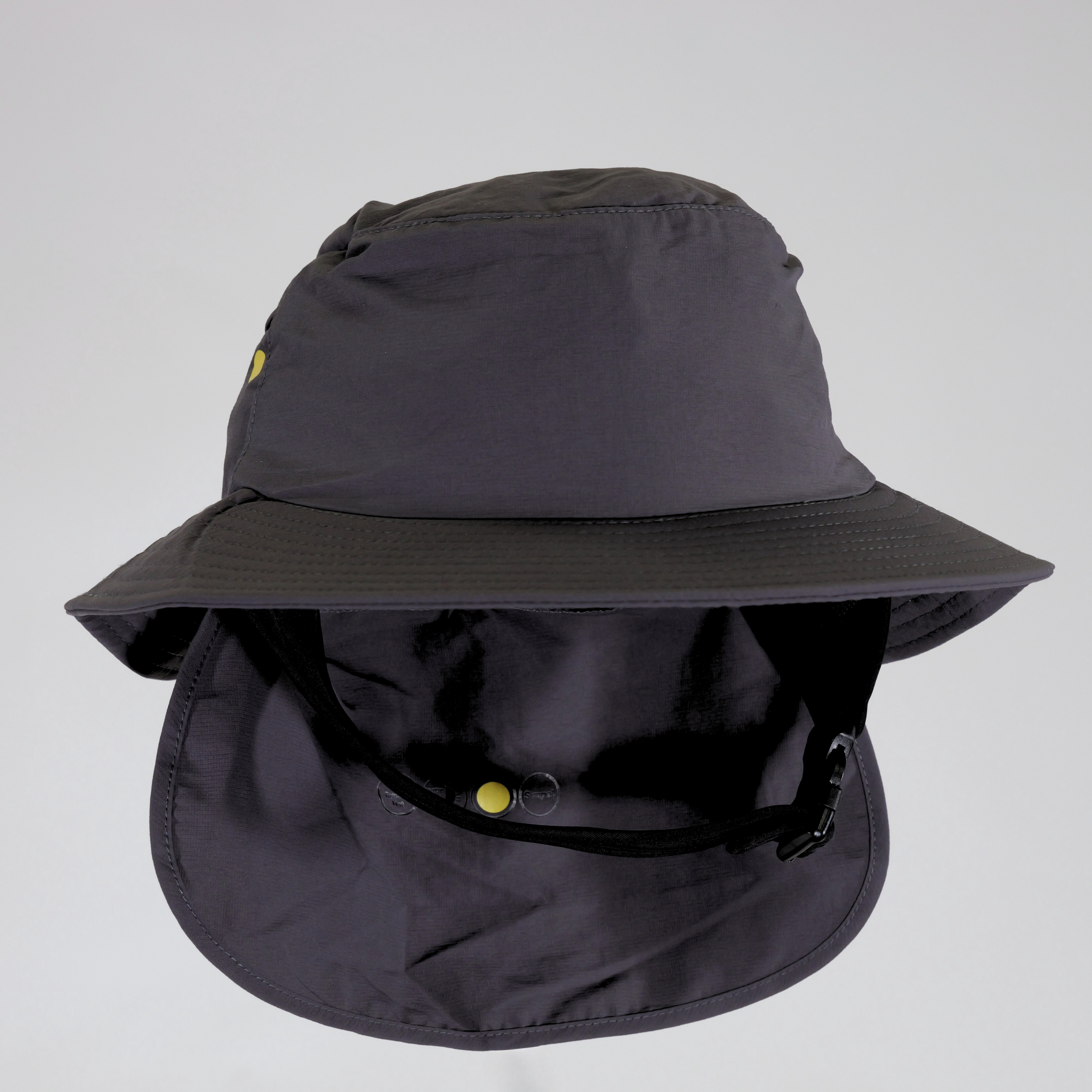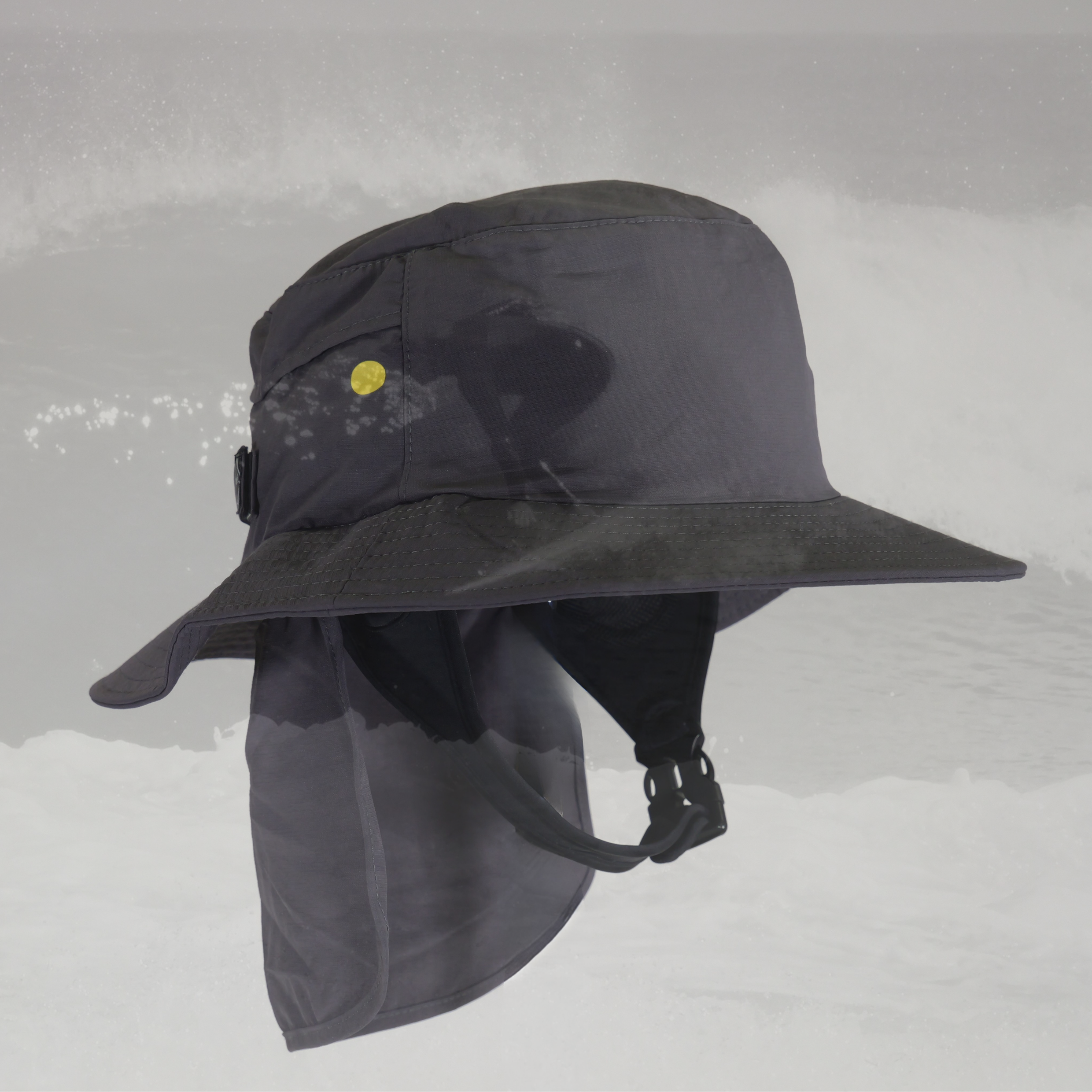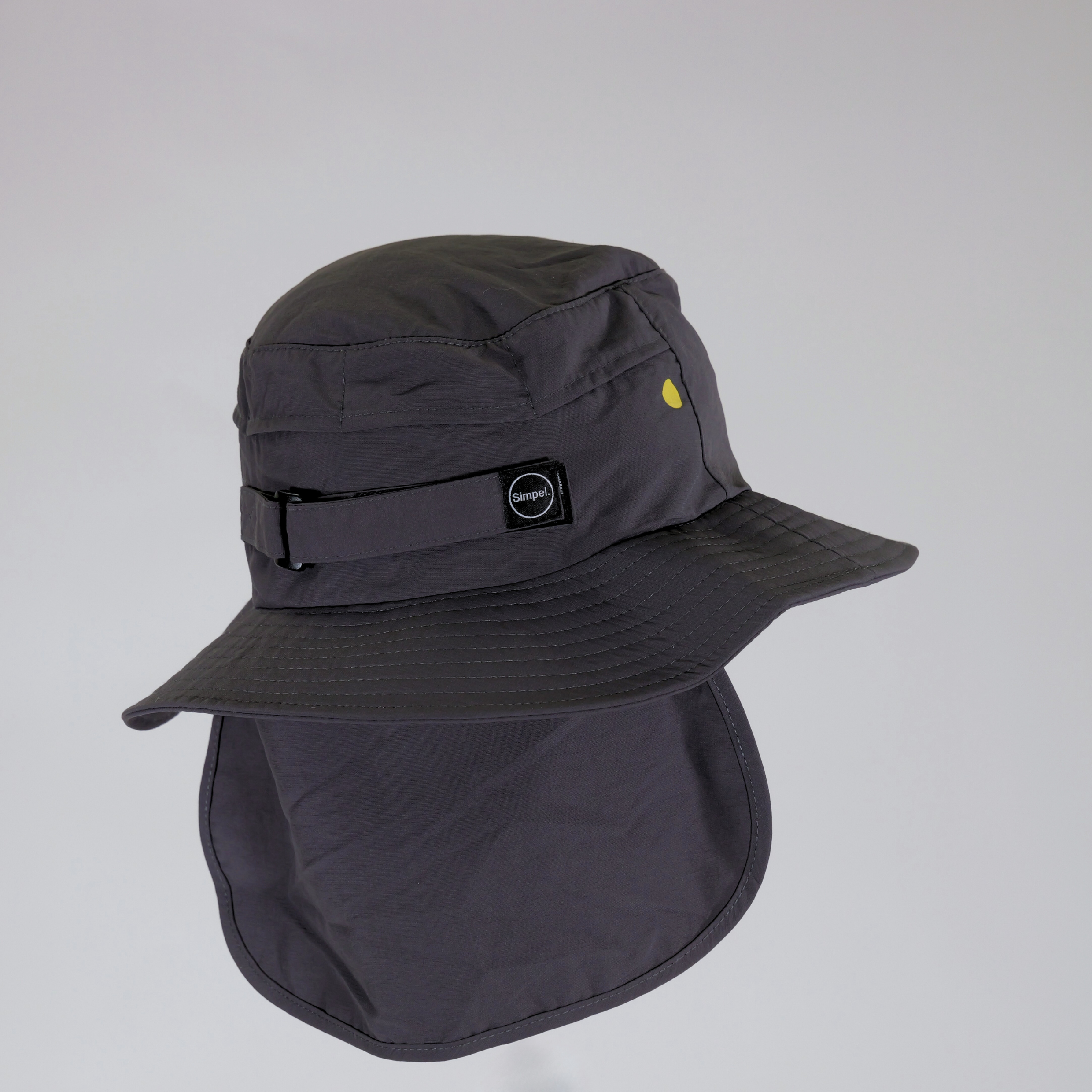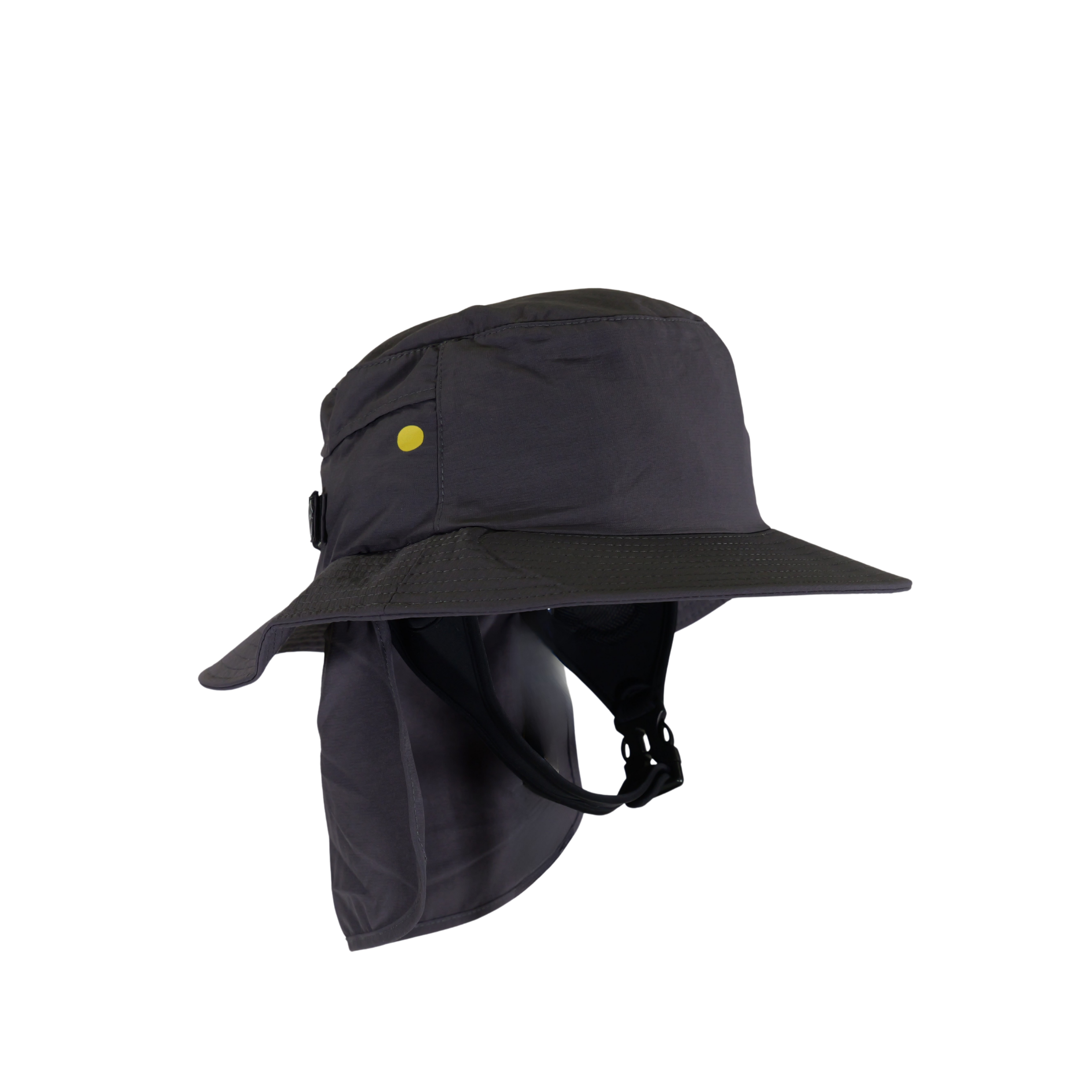The Simpel Wide Brim Surf Bucket Hat in charcoal is designed to deliver reliable sun protection in the water. A neoprene chin strap with rear Velcro adjustment ensures a secure, comfortable fit for all head sizes.